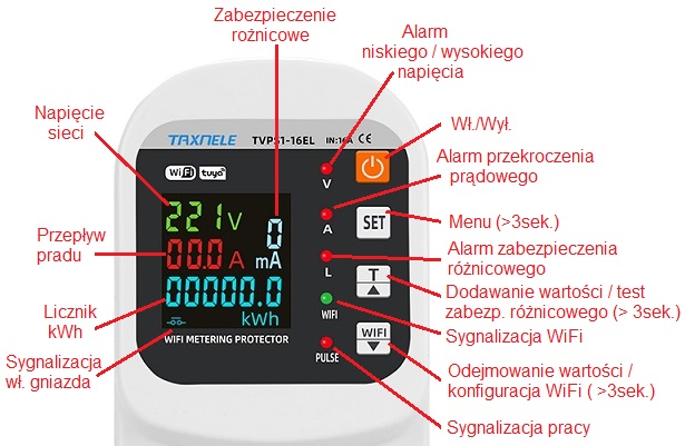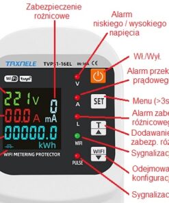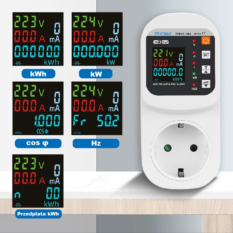 – prezentowane parametry: V, A, kWh, kW, cos φ, Hz, różn. (mA)